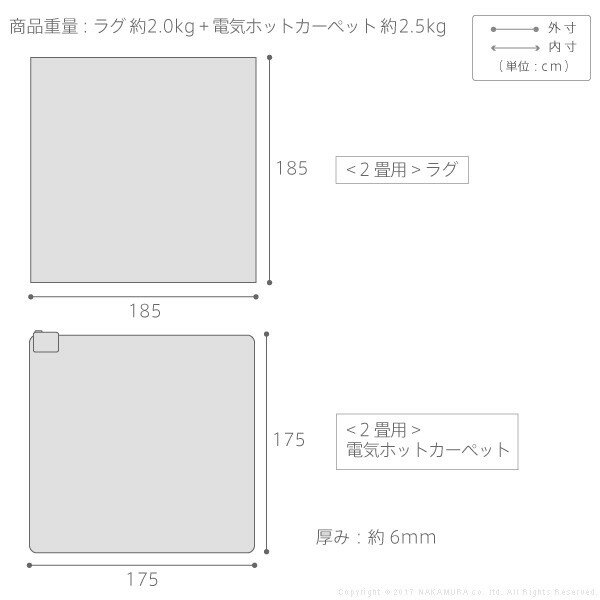 【セット構成】 カバーx1 ホットカーペット本体x1 【カラーバリエーション】 ■カバー ブラウン・グレー 【仕様】 ■カバー 表地:ポリエステル53%、綿39%、レーヨン8% 裏地:ポリエステル100%(不織布) 中綿:ポリエステル100%(固綿) 裏面:ノンスリップ加工、四隅ゴム付き ■ホットカーペット本体 表面材:ポリエステル100%(タフト) 裏面材:ポリエステル100%(フェルト) ダニ退治、6時間自動切タイマー付き 【サイズ】 ■カバー サイズ:185x185cm ■ホットカーペット本体 幅176x奥行176cm 厚み:6mm 重量:約2.5kg 株式会社ナカムラ(I-2000159)